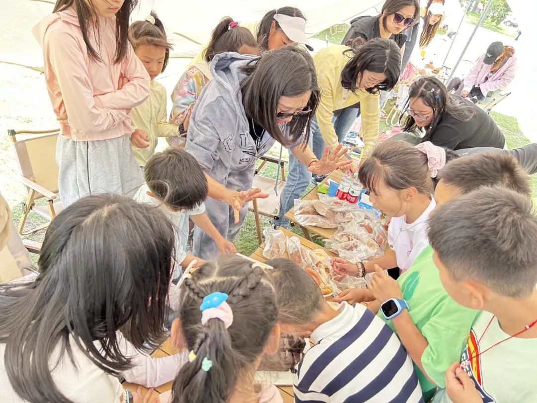 玩累了的孩子們圍坐在露營桌旁,迎來了最期待的 "甜蜜時刻"。當(dāng)巧克力蛋糕閃亮登場,孩子們的眼睛都是亮晶晶的。大家你一口我一口,巧克力的絲滑、濃郁的奶味在舌尖綻放。包裝袋的沙沙聲里,薯片、糖果、餅干在小手間傳遞,零食的自由也可以成為節(jié)日里最簡單的小幸福。