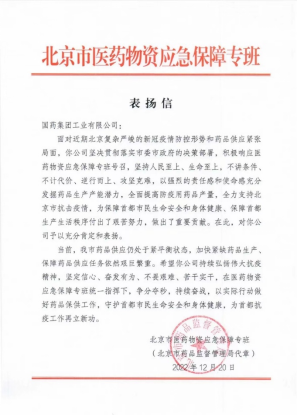 國(guó)藥工業(yè)收到北京市醫(yī)藥物資應(yīng)急保障專班表?yè)P(yáng)信