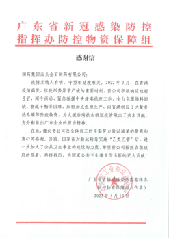 國(guó)藥金石收到廣東省新冠感染防控物資保障組感謝信