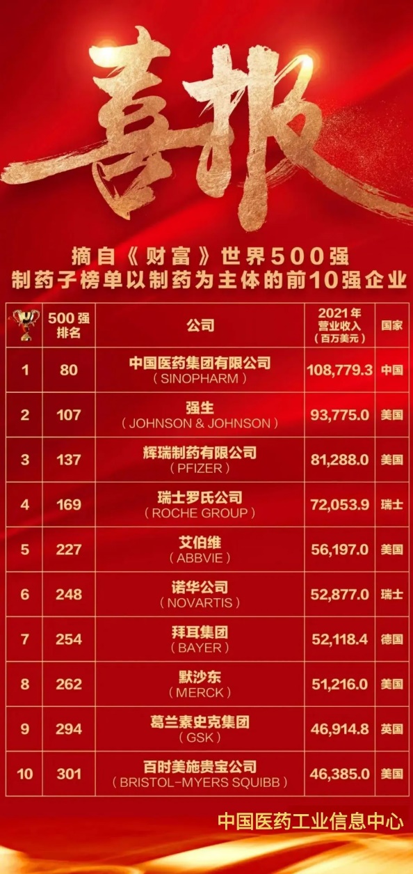 財(cái)富中文網(wǎng)于北京時(shí)間2022年8月3日發(fā)布了最新的《財(cái)富》世界500強(qiáng)排行榜。國藥集團(tuán)憑借優(yōu)異的發(fā)展業(yè)績,位列第80位,較2021年上升29位,首次邁進(jìn)世界100強(qiáng)行列。同時(shí)更值得關(guān)注的是,根據(jù)中國醫(yī)藥工業(yè)信息中心發(fā)布的信息顯示,國藥集團(tuán)在進(jìn)入世界前100強(qiáng)的同時(shí)還位居全球制藥企業(yè)第一位,實(shí)現(xiàn)了中國醫(yī)藥企業(yè)的歷史性突破。