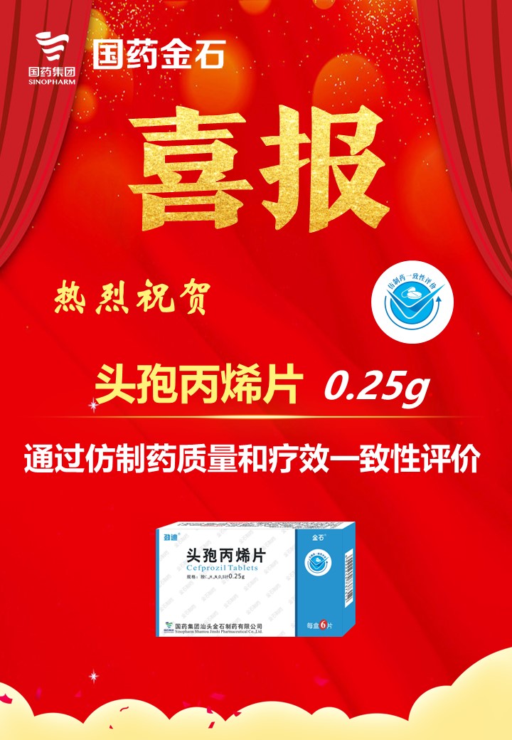 近日,國(guó)藥集團(tuán)汕頭金石制藥有限公司收到國(guó)家藥品監(jiān)督管理局核準(zhǔn)簽發(fā)的0.25g頭孢丙烯片《藥品補(bǔ)充申請(qǐng)批準(zhǔn)通知書》,批準(zhǔn)該藥品通過仿制藥質(zhì)量和療效一致性評(píng)價(jià),至此,國(guó)藥金石已有5個(gè)品種9個(gè)規(guī)格通過仿制藥質(zhì)量和療效一致性評(píng)價(jià),頭孢丙烯系列產(chǎn)品所有規(guī)格均已過評(píng)。
