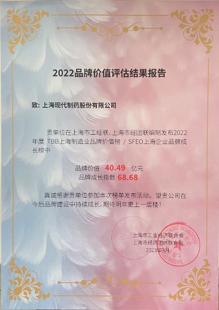 2022年5月中國(guó)品牌日活動(dòng)期間,2023TBB/SFEO上海品牌價(jià)值系列榜單在首屆中國(guó)制造發(fā)展論壇暨第九屆中國(guó)品牌經(jīng)濟(jì)(上海)論壇上正式發(fā)布,國(guó)藥現(xiàn)代(600420)連續(xù)兩年成功入選“TBB上海制造品牌價(jià)值榜”。
