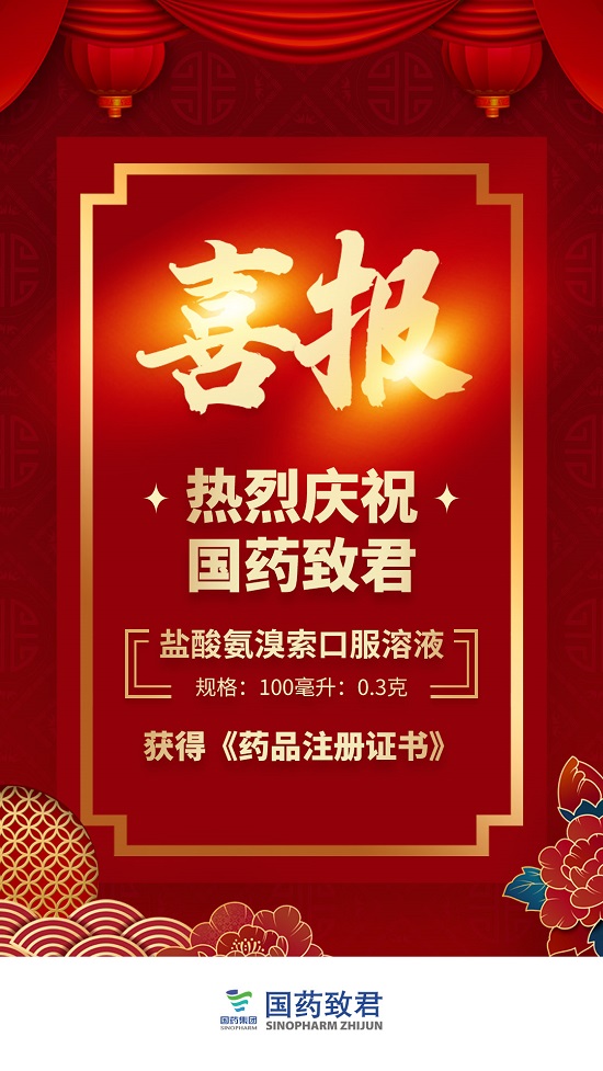 喜報連連!國藥致君仿制藥研發(fā)捷報頻傳,繼孟魯司特鈉咀嚼片、硫酸氫氯吡格雷片批準上市之后,新年伊始再次收到國家藥品監(jiān)督管理局核準簽發(fā)的《藥品注冊證書》,批準鹽酸氨溴索口服溶液(100ml:0.3g)通過注冊。該產(chǎn)品以化學藥品注冊分類3類獲批上市,視同通過仿制藥質量和療效—致性評價。