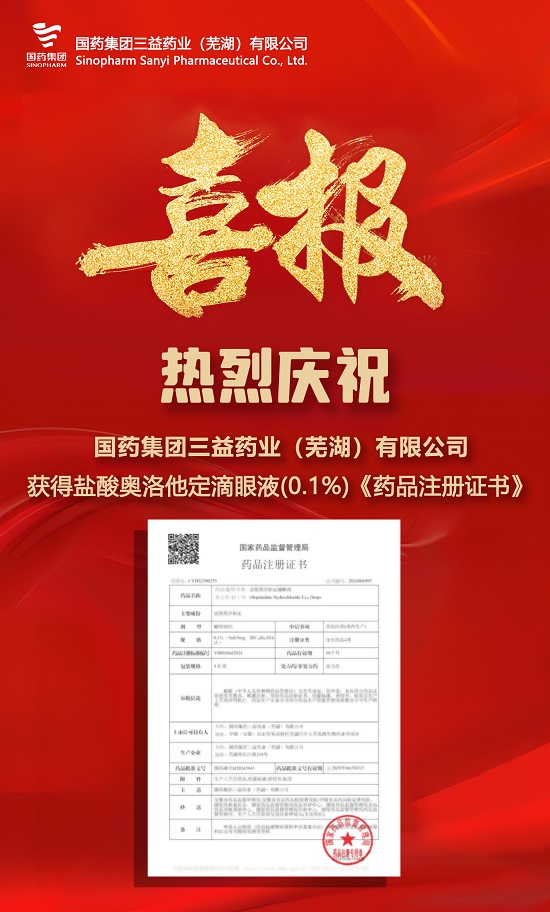 近日,國藥集團(tuán)三益藥業(yè)(蕪湖)有限公司收到國家藥品監(jiān)督管理局核準(zhǔn)簽發(fā)的鹽酸奧洛他定滴眼液《藥品注冊證書》。