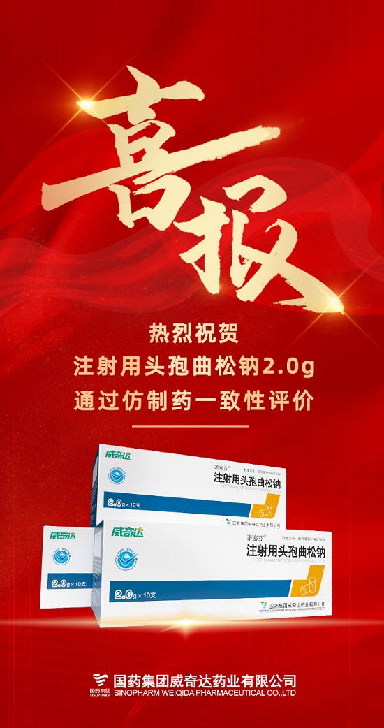 4月15日,國(guó)藥威奇達(dá)收到國(guó)家藥品監(jiān)督管理局核準(zhǔn)簽發(fā)的《藥品補(bǔ)充申請(qǐng)批準(zhǔn)通知書》,批準(zhǔn)注射用頭孢曲松鈉(2.0g)通過(guò)仿制藥質(zhì)量和療效一致性評(píng)價(jià)。