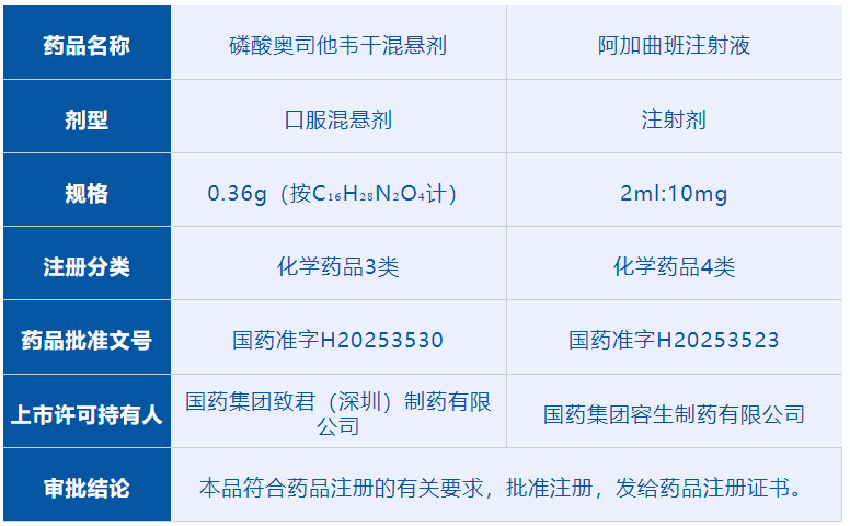 近日,子公司國藥致君、國藥容生分別收到國家藥品監(jiān)督管理局核準(zhǔn)簽發(fā)的《藥品注冊證書》,磷酸奧司他韋干混懸劑(0.36g)和阿加曲班注射液(2ml:10mg)符合藥品注冊的有關(guān)要求,批準(zhǔn)注冊。