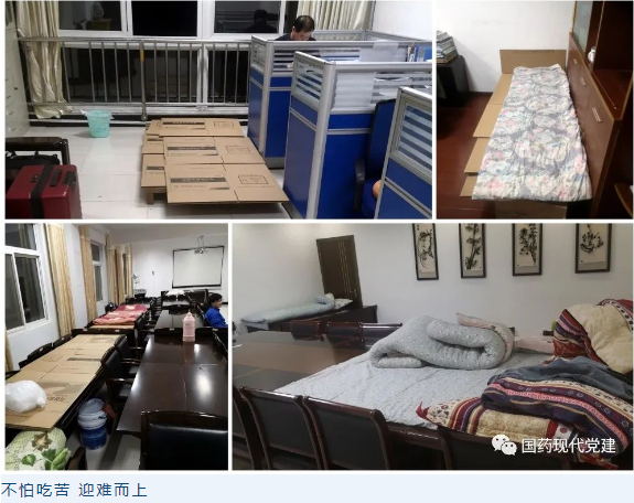 4月18日,公司全體黨政班子成員帶領40余名員工帶著被褥鋪蓋,或騎車、或自駕、或搭乘班車,肩負同樣的責任,“舍小家、為大家”進駐公司開始封閉生產。疫情突發(fā),駐廠員工在物資緊缺、住宿條件簡陋的情況下,不怕吃苦、迎難而上,在人員最為精簡的狀況下,全力投入生產,齊心協(xié)力為藥品供應保駕護航。人員不足,黨員干部帶頭,帶領車間一線和管理人員卸車搬運入庫包材;沒有宿舍床鋪,大家集中在會議室、辦公室打地鋪;沒有浴室,大家克服困難簡單洗漱……4月19日,隨著第二批駐廠職工入住,國藥三益駐廠人員已達51人,這就是為防疫抗疫堅守崗位,保供保產的國藥三益人!